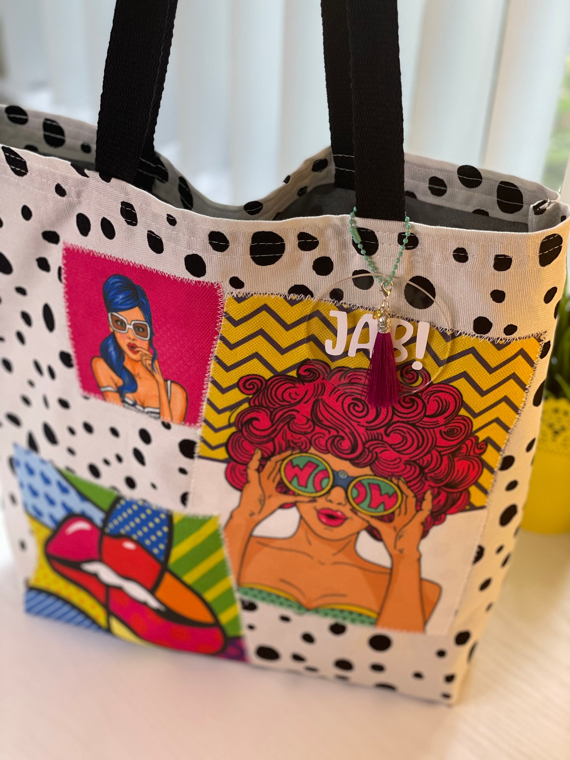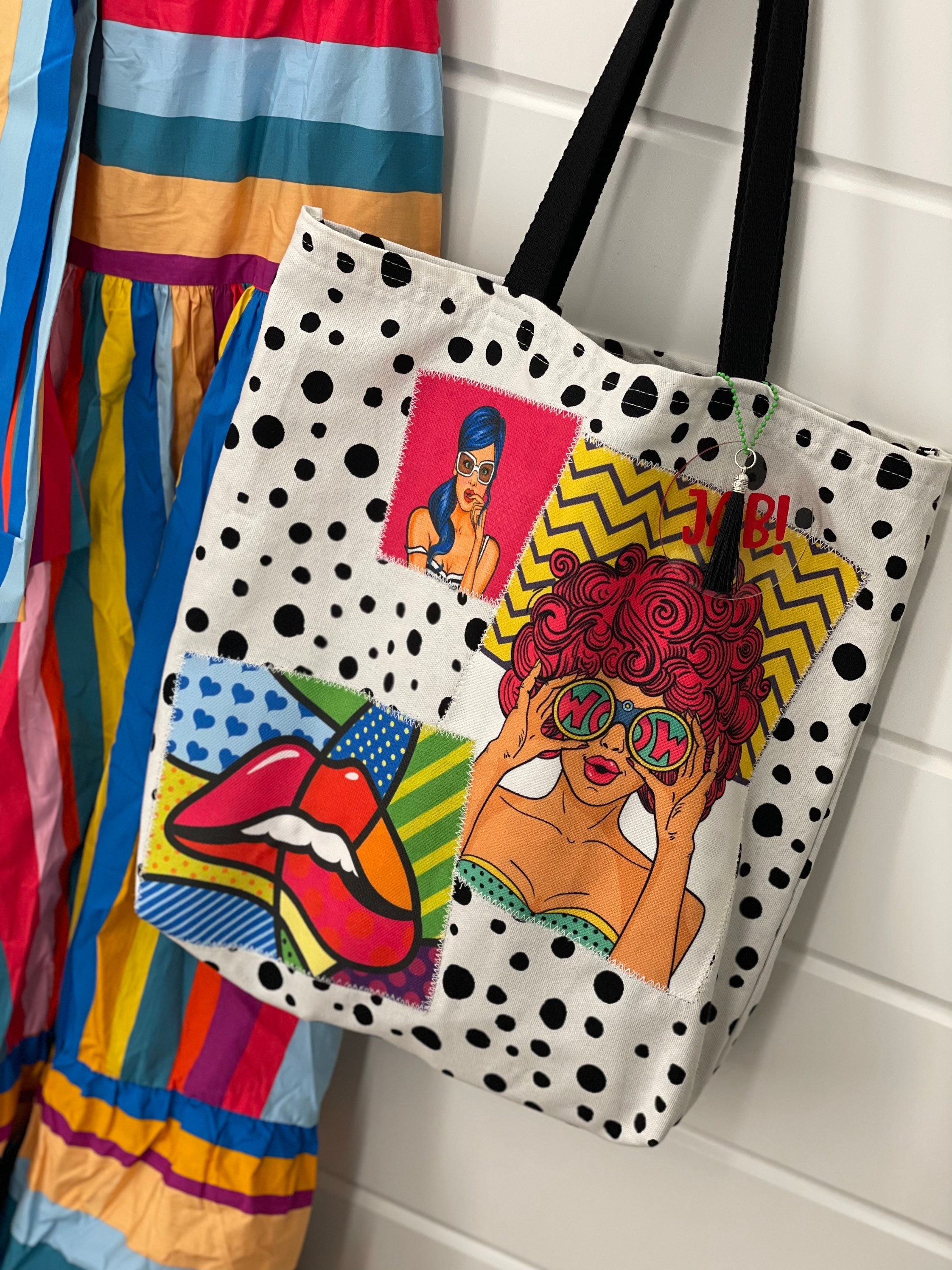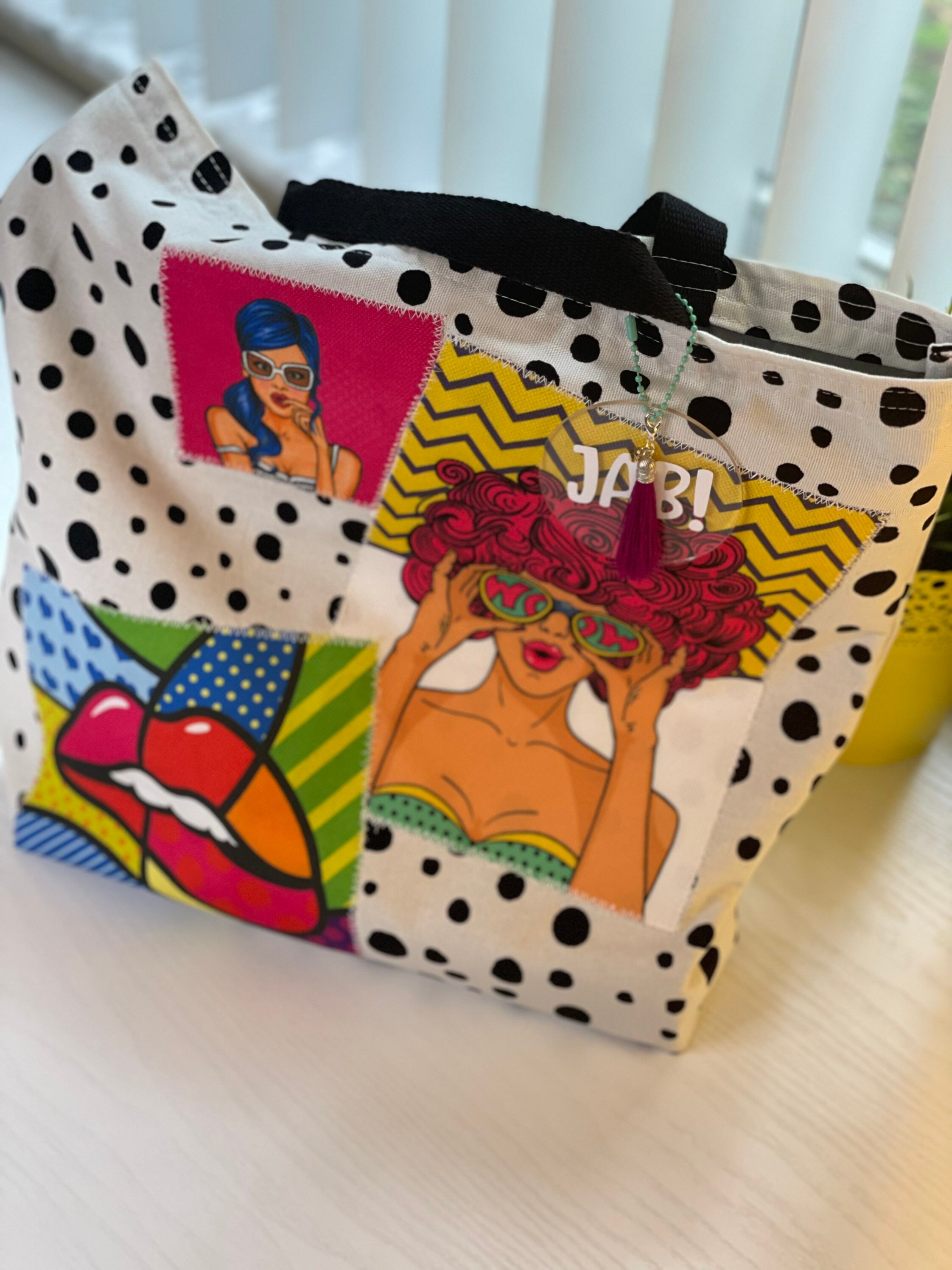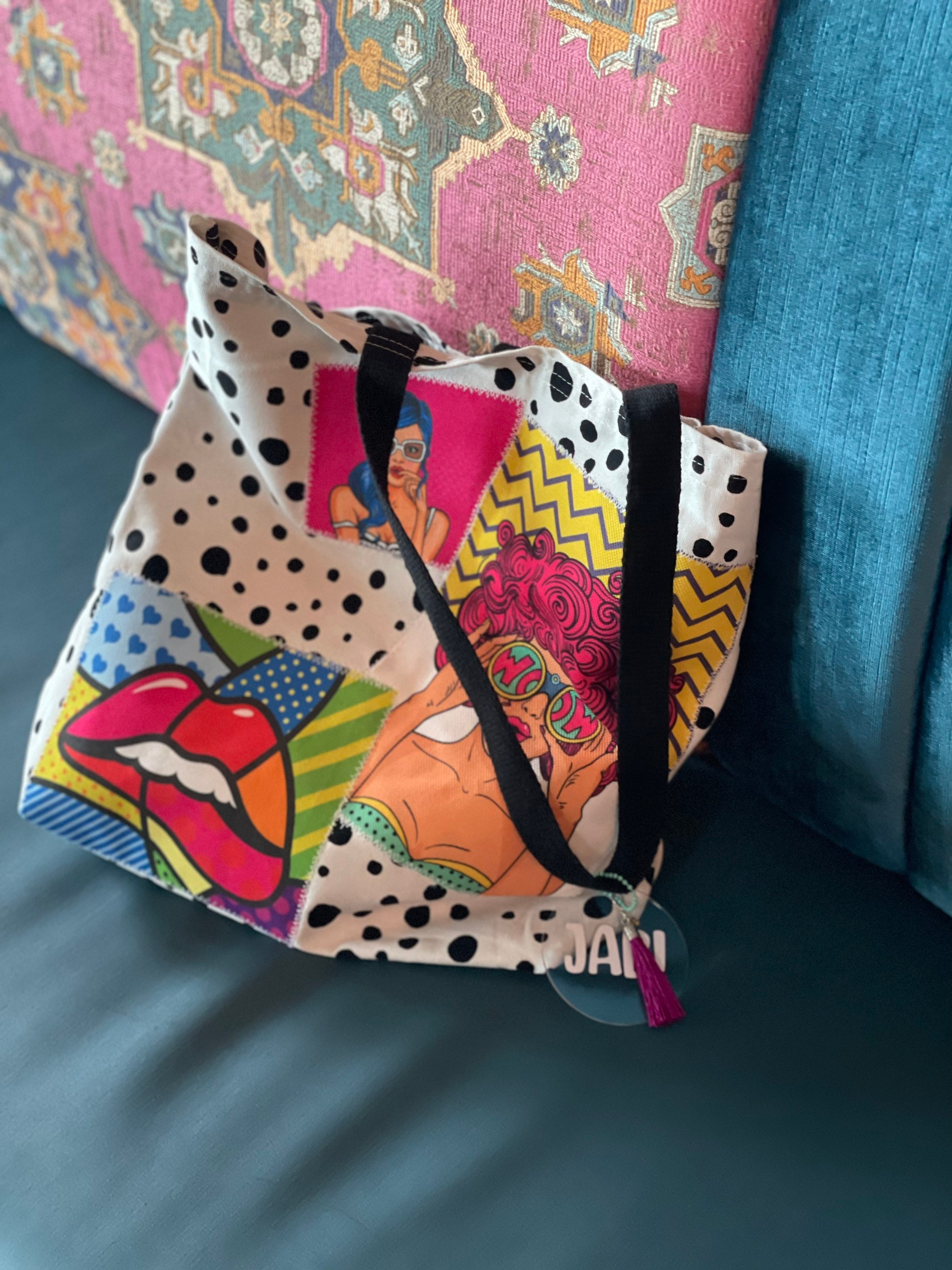 New handmade colorful tote in canvas and patches on popart upholstery fabric.