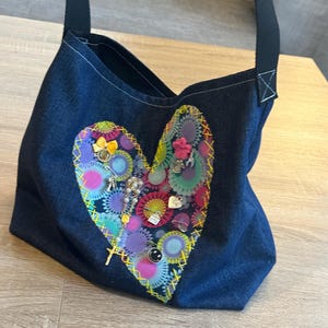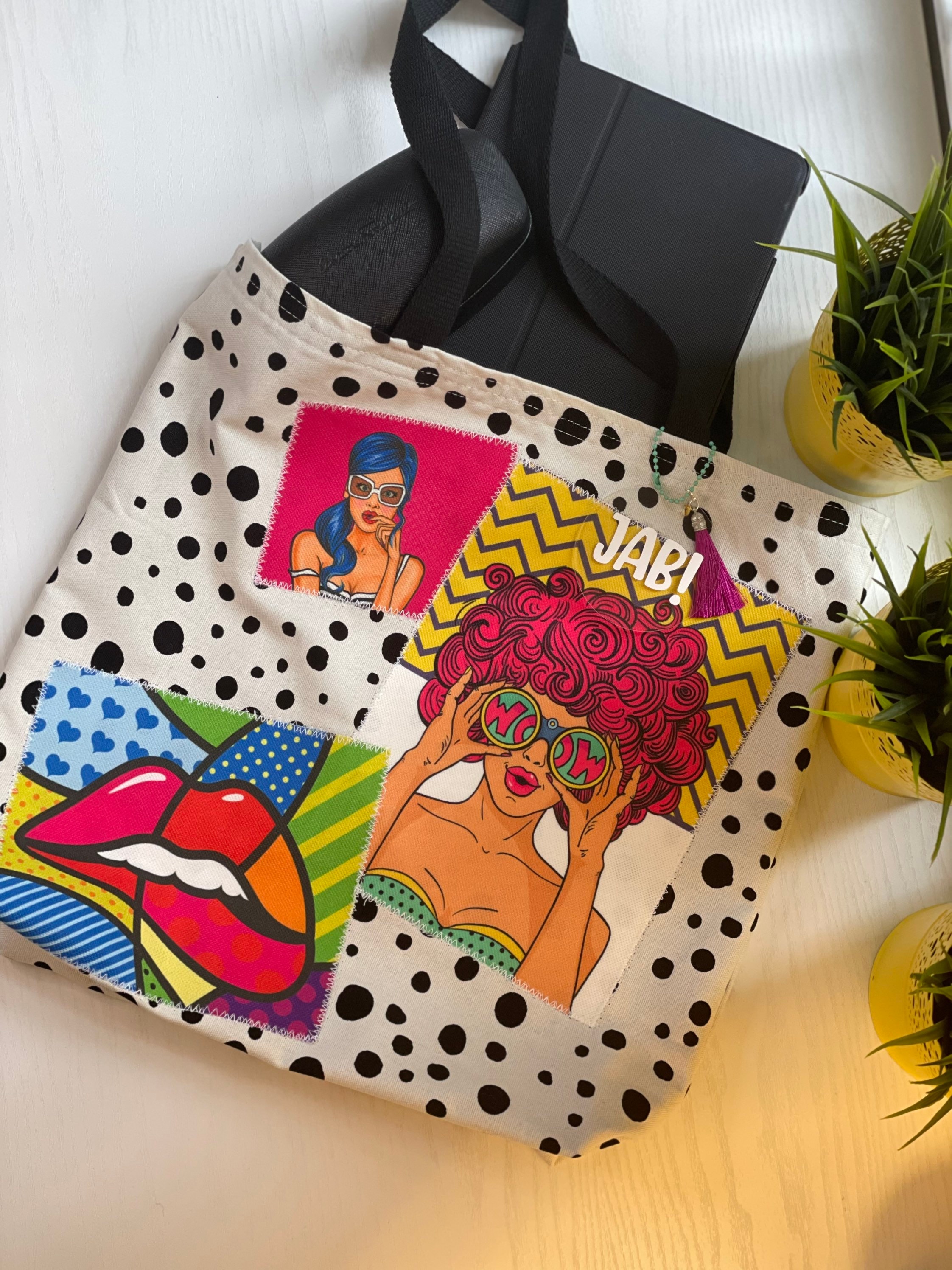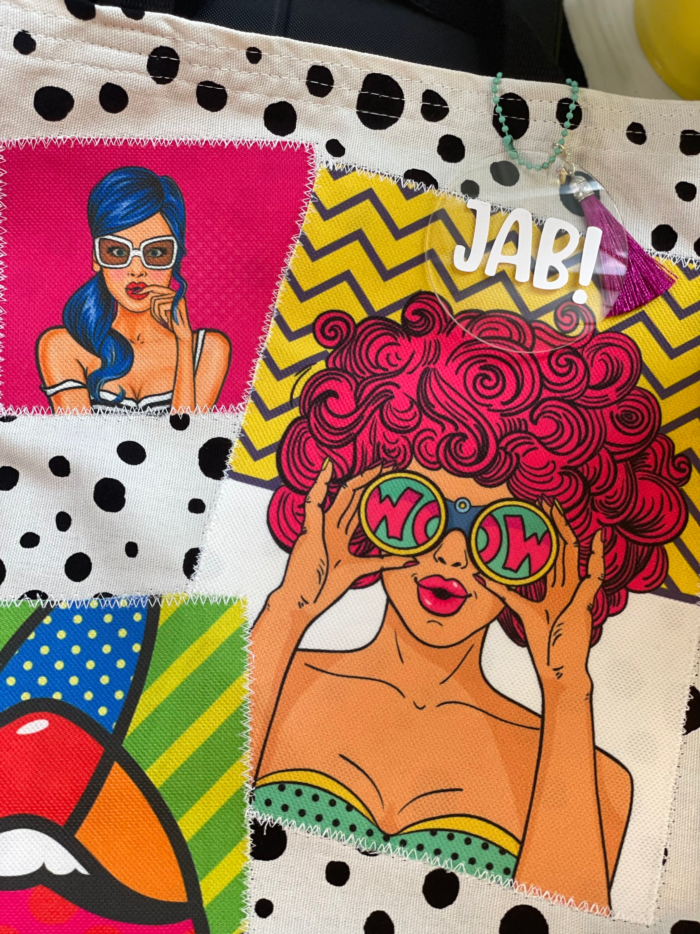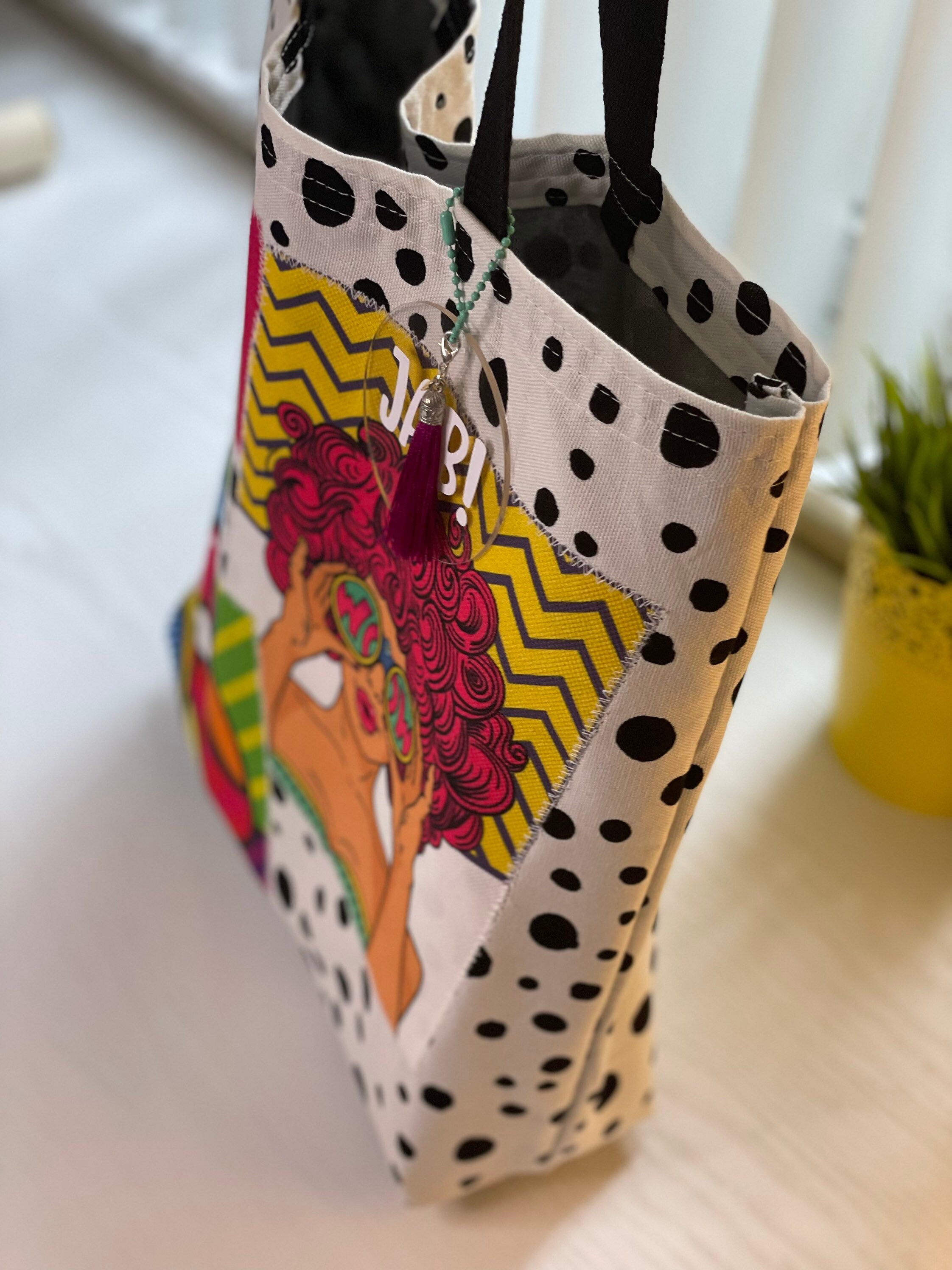 New handmade colorful tote in canvas and patches on popart upholstery fabric.
