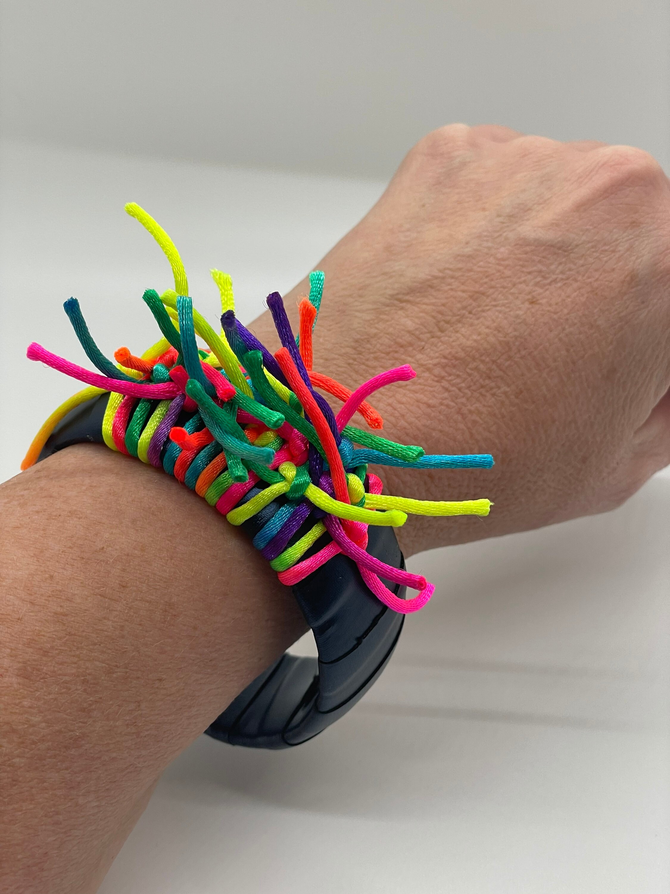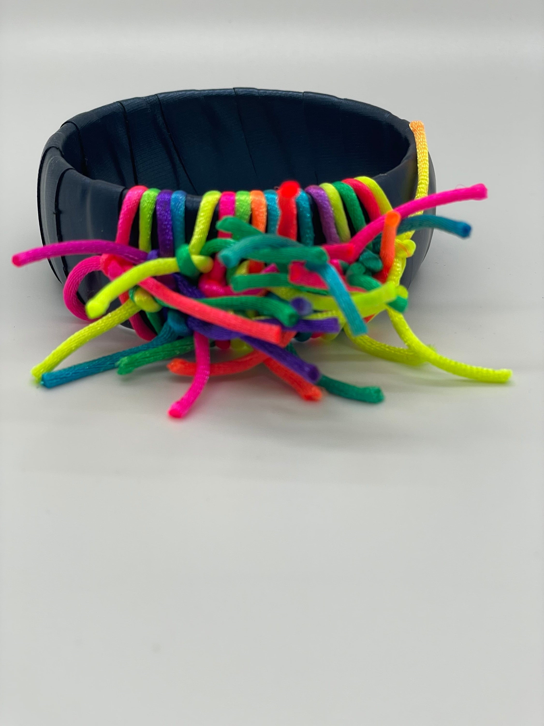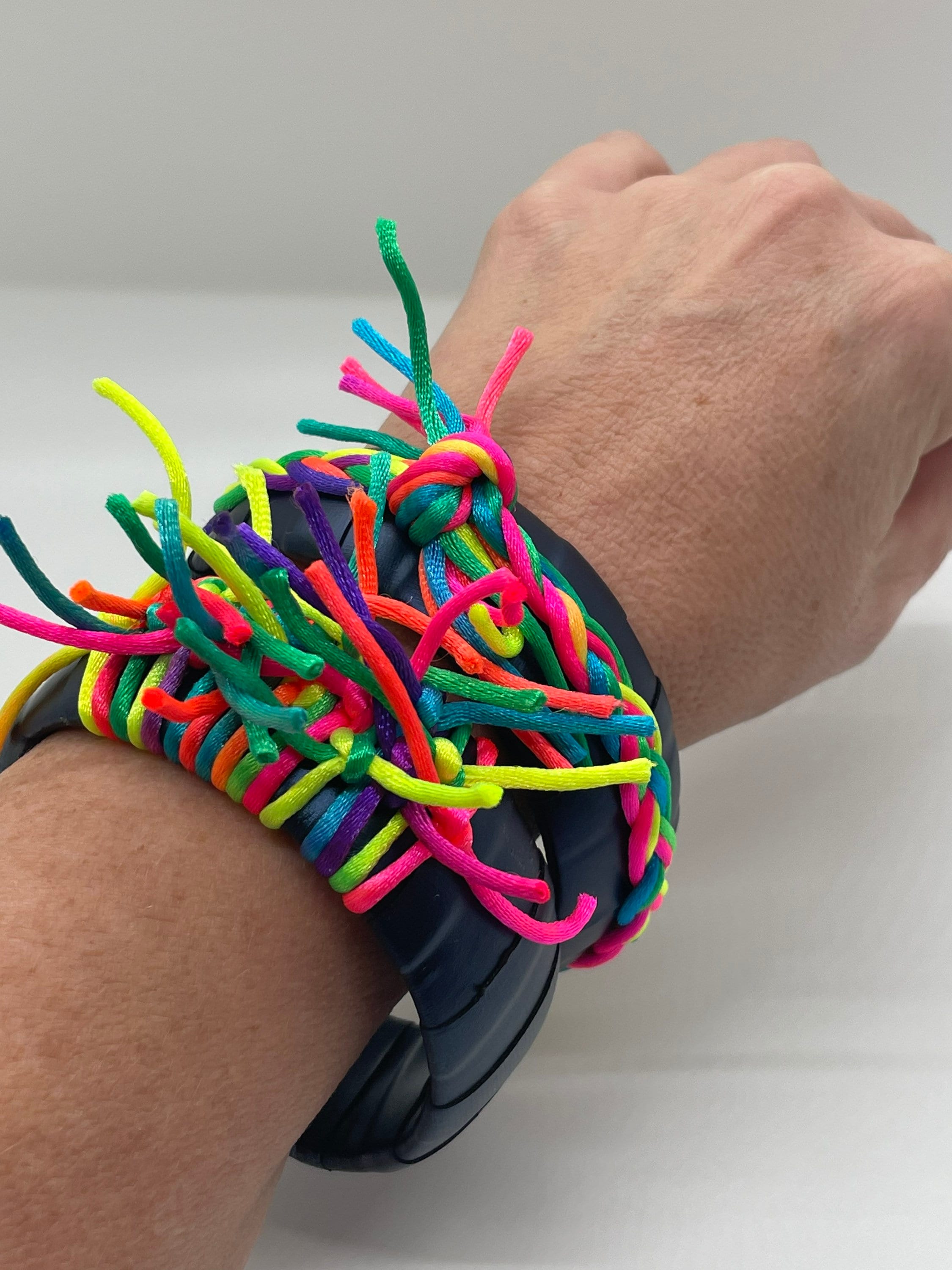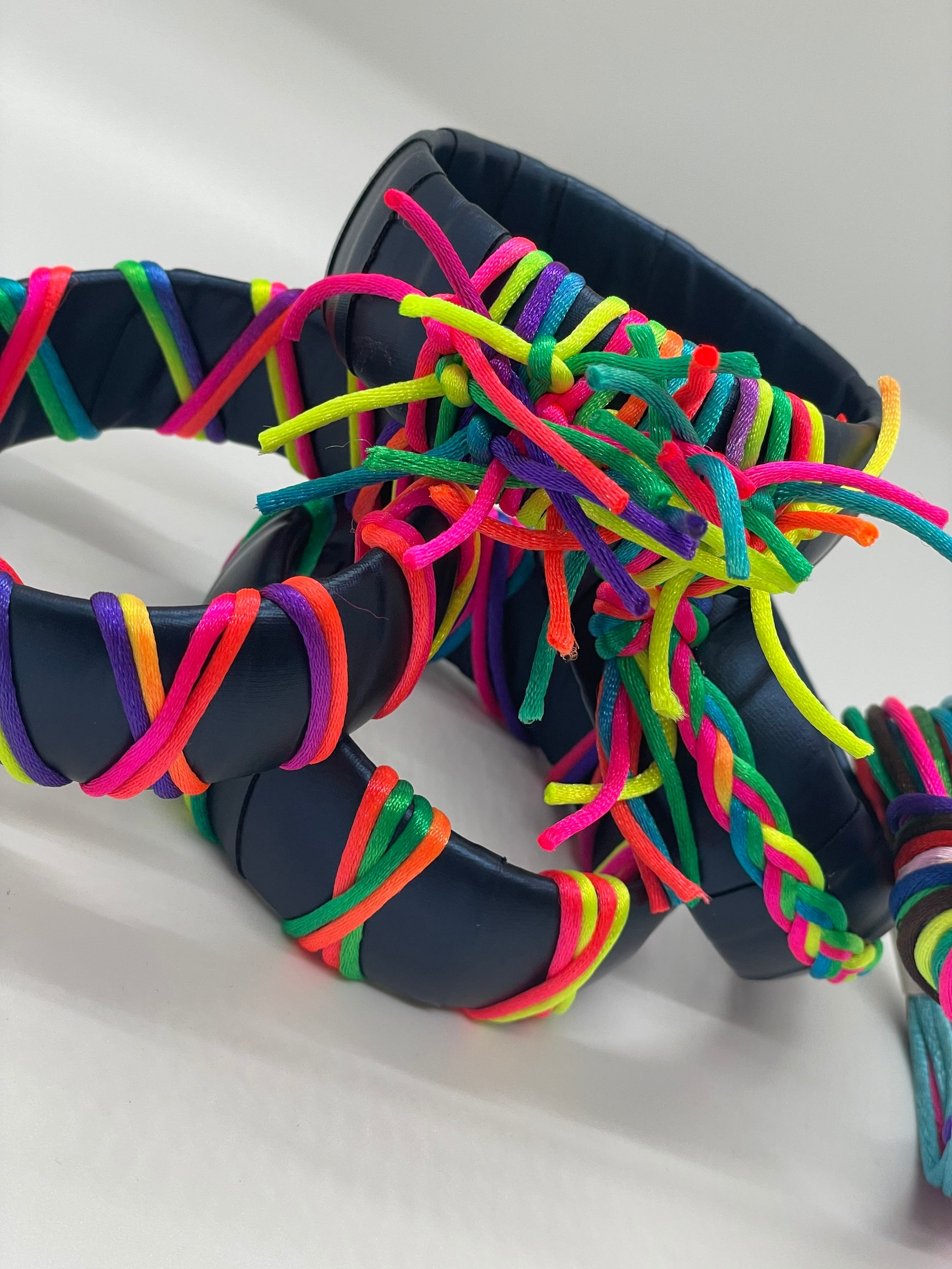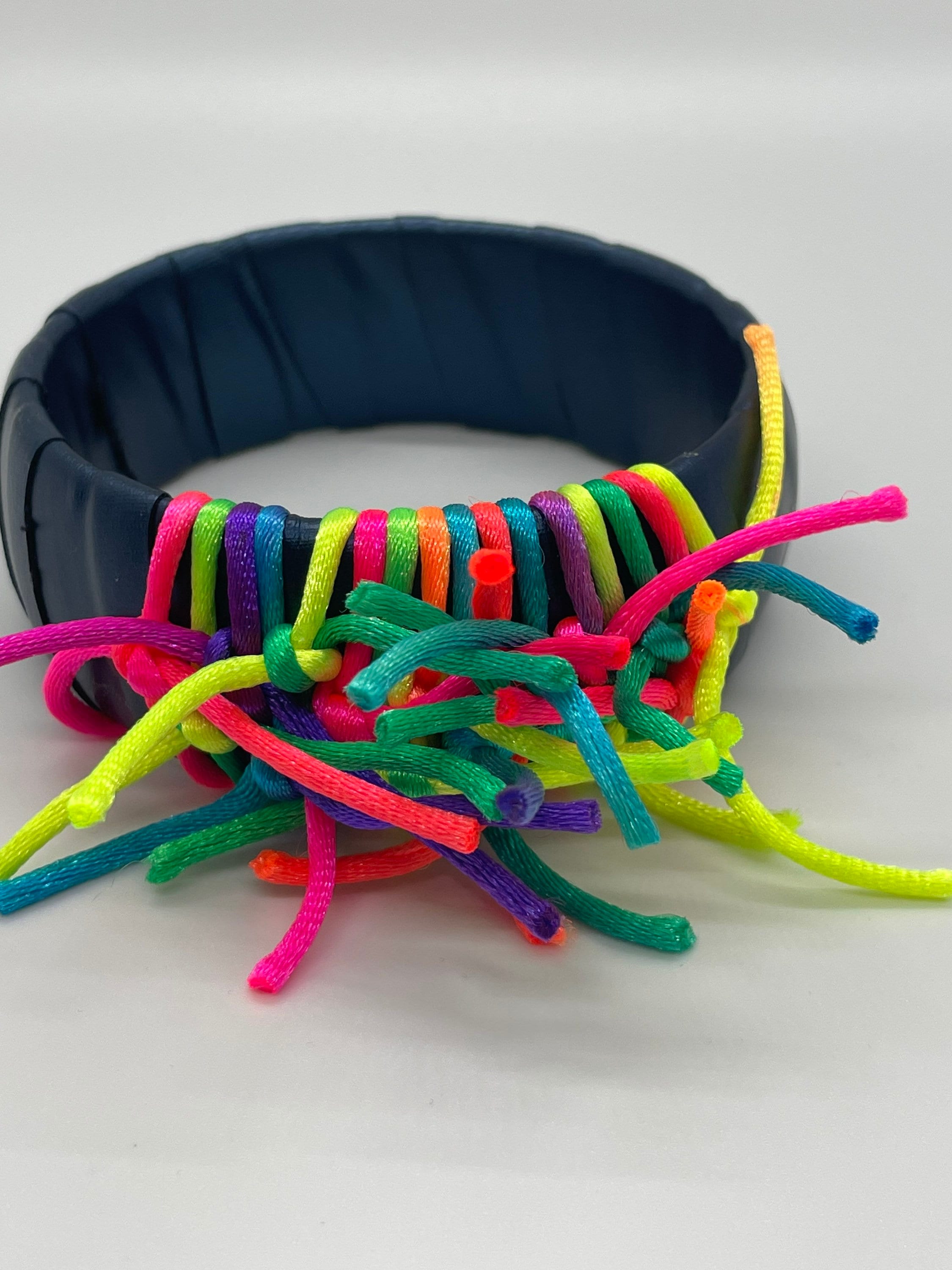 Bangle on dark blue cosplay fabric with accents in colorful satin cords. One of a kind.
