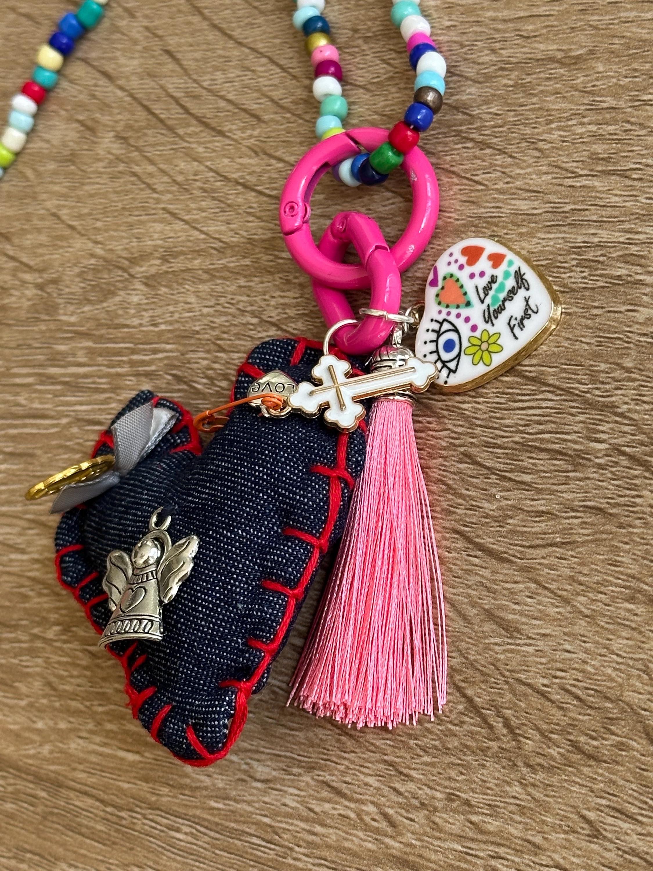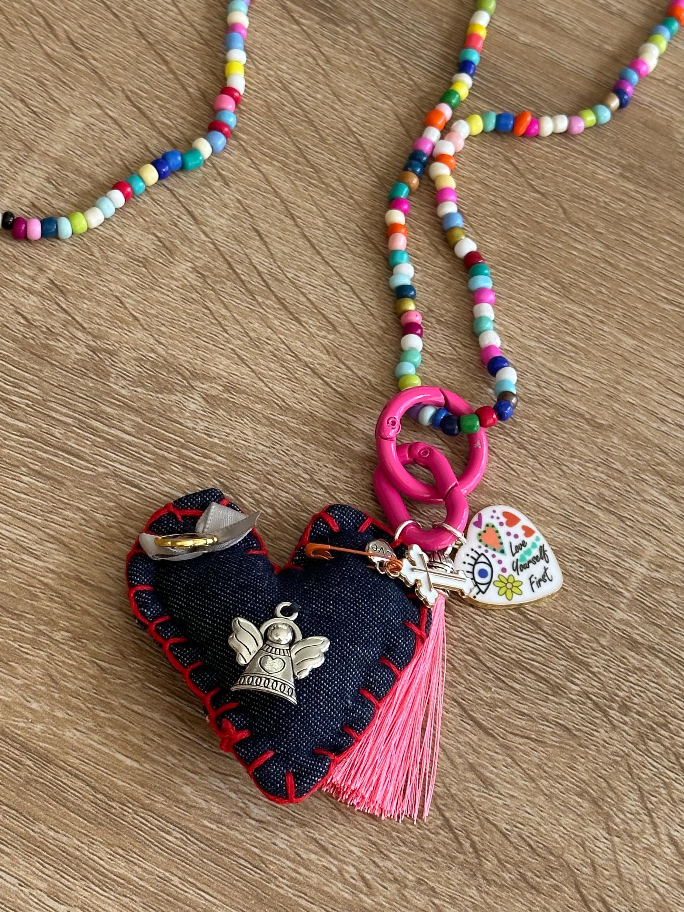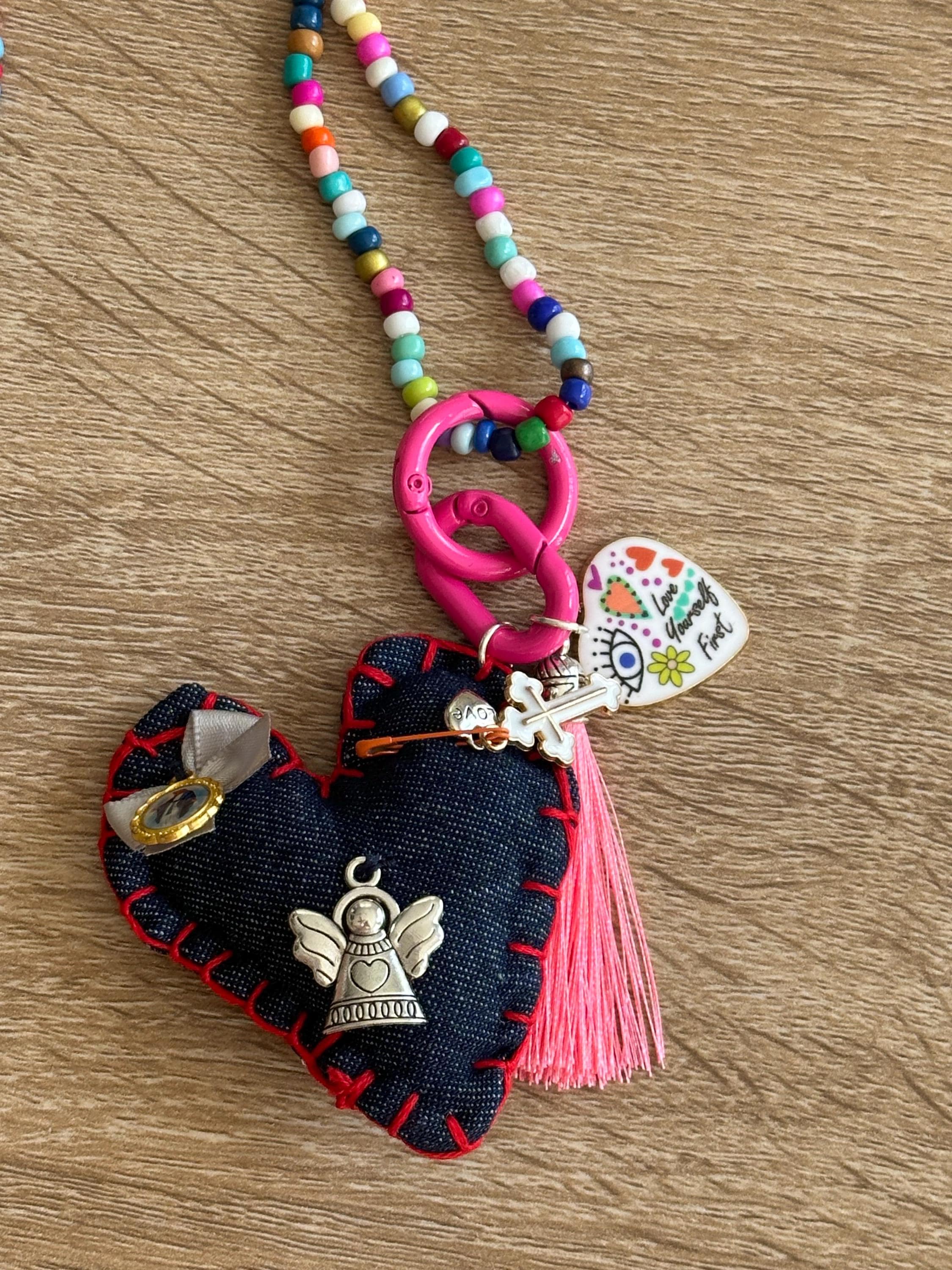 Collar hecho a mano en piedras a colores. Contiene un corazón hecho en tela lleno de medallas y diversos dijes que nos llenan de buenas vibras, protección, fe y oración.