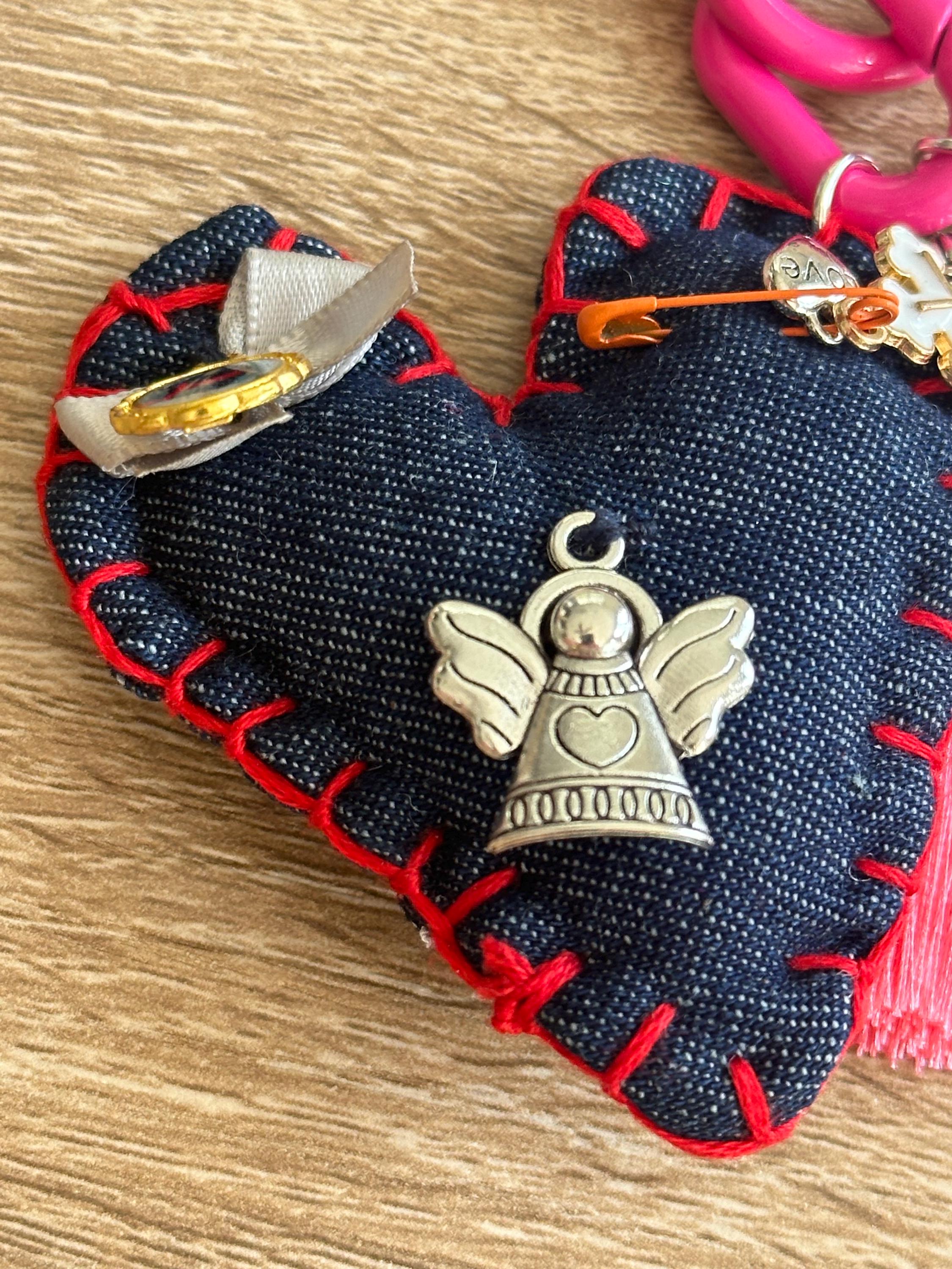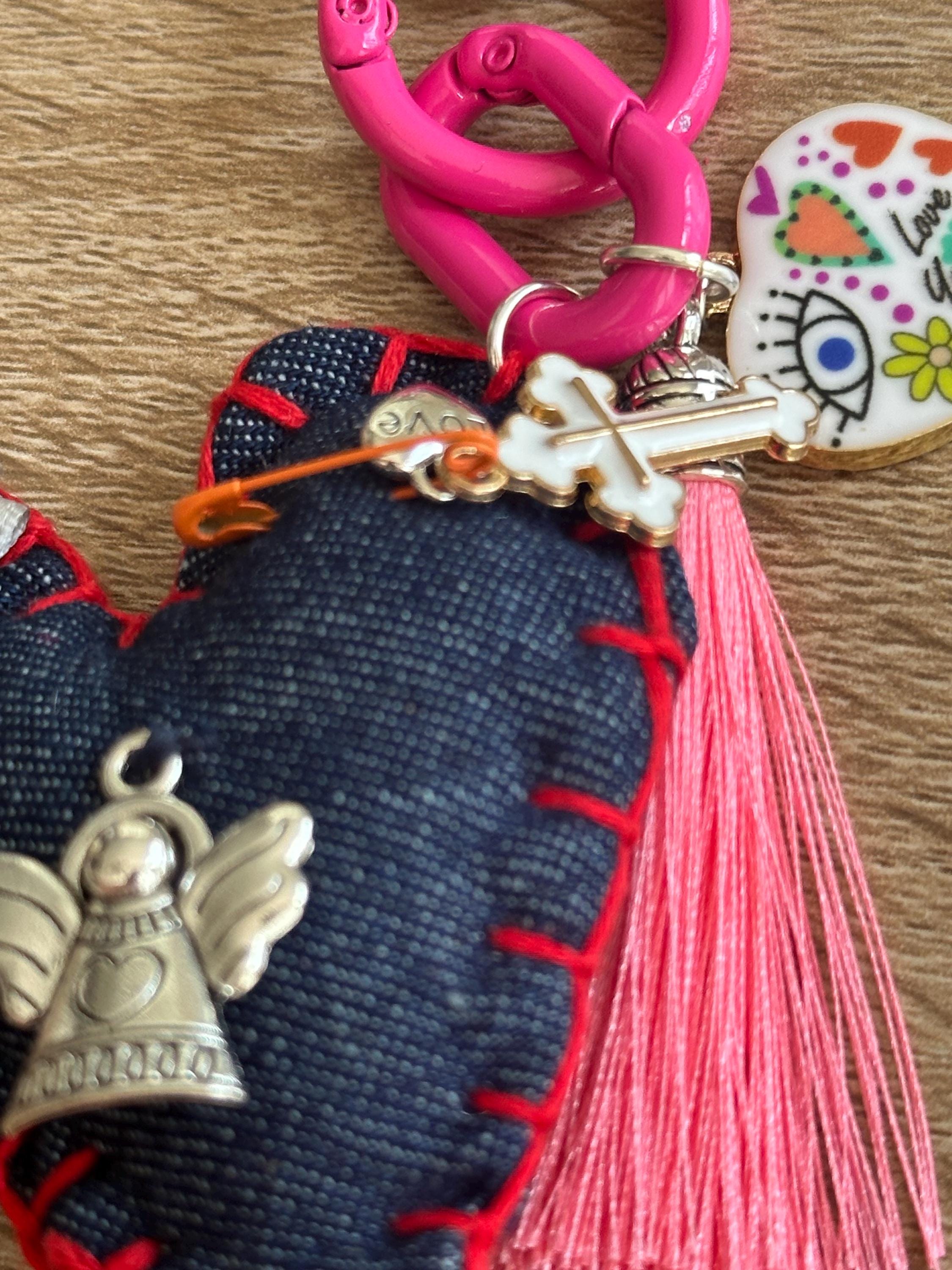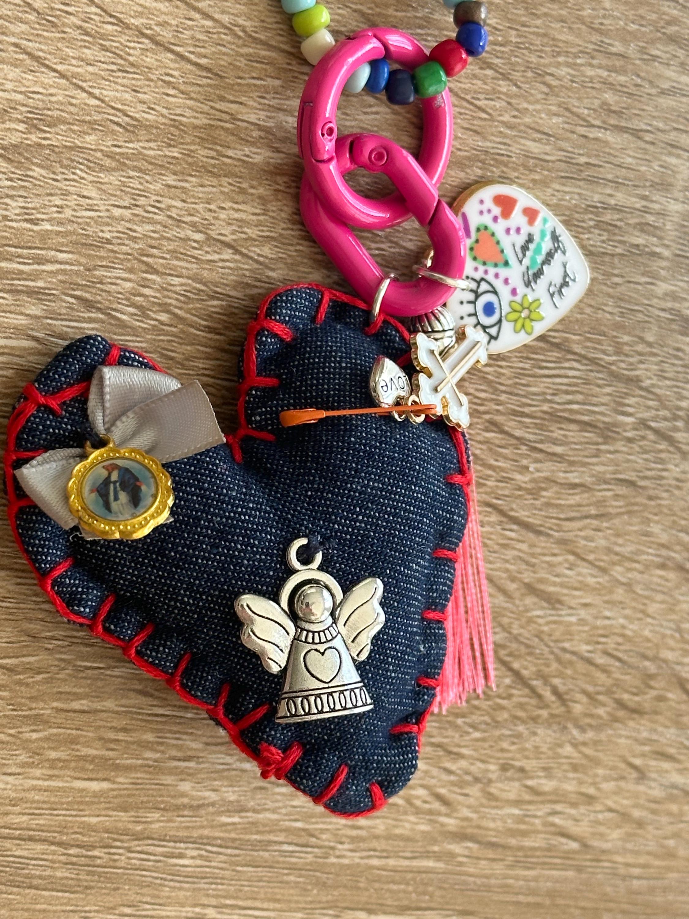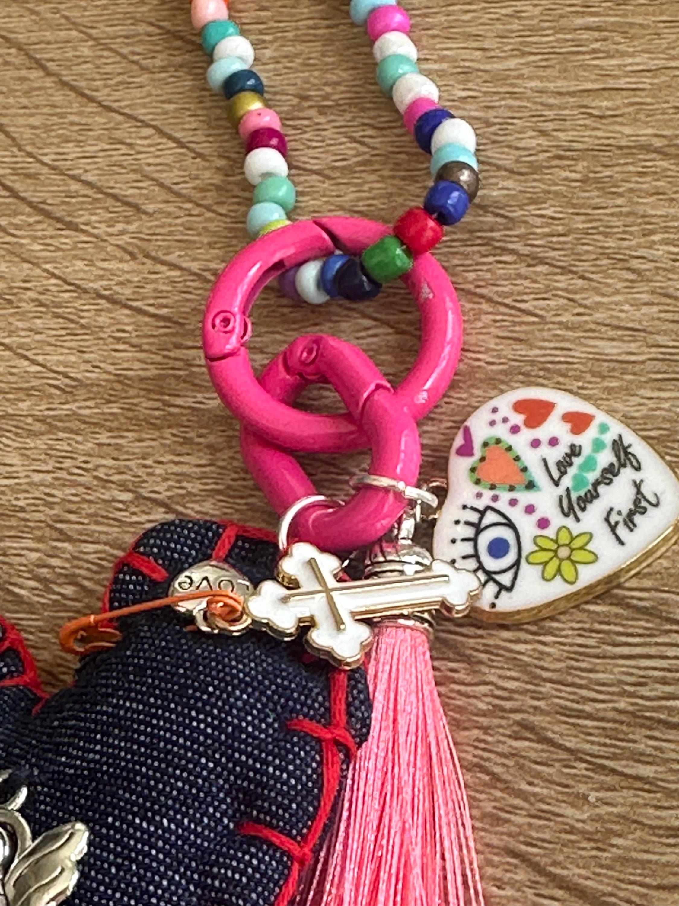 Collar hecho a mano en piedras a colores. Contiene un corazón hecho en tela lleno de medallas y diversos dijes que nos llenan de buenas vibras, protección, fe y oración.